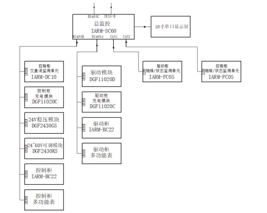 監(jiān)控部分采用集散方式對(duì)系統(tǒng)進(jìn)行監(jiān)測(cè)和控制,驅(qū)動(dòng)柜和控制柜的饋電的運(yùn)行狀態(tài)、電源模塊運(yùn)行參數(shù),分別由兩臺(tái)智能監(jiān)控系統(tǒng)采集處理,由監(jiān)控模塊統(tǒng)一處理后顯示在觸摸屏上,同時(shí)可通過(guò)人機(jī)交互操作方式對(duì)系統(tǒng)進(jìn)行設(shè)置和控制,還可接入遠(yuǎn)程監(jiān)控。監(jiān)控模塊還能對(duì)每個(gè)充電模塊進(jìn)行均/浮充控制、限流